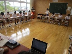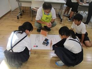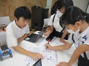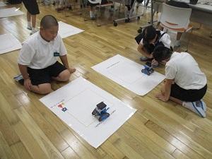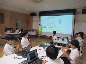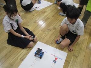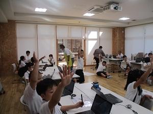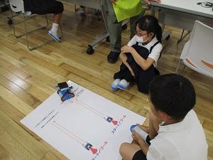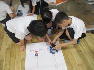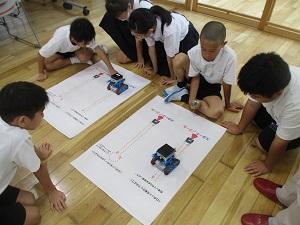はじめに、ichigojamのLEDが付いたり消えたりするコマンドを打ち、もっと長くつけるにはどうしたらいいか試してみたり、ロボットが動かすことに応用したりしました。次の時間は本格的なプログラミングです。ロボットにどんな動きをさせたいか、自分たちで考え、実際に打ち込んで動かしてみる体験をしました。実際にやってみると、ちょっとしたミスで思っていた動きがなかなかできず難しい面もありましたが、筋道を立てて考えていくことの大切さを実感できたようです。昨日に引き続きご指導いただいた、PFUの皆様、2日間のご指導、本当にありがとうございました。