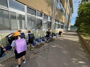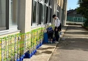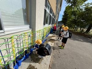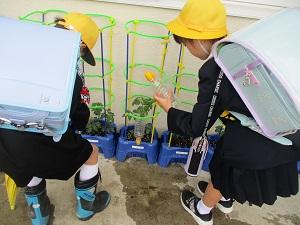 さて2年生は、生活科の時間に野菜を育てています。学校園にはいろいろな野菜を育てるのですが、昨年アサガオを育てた植木鉢には、ミニトマトの苗を植えることになりました。毎朝、玄関に入る前に子供たちはせっせとお水をあげています。「風で倒れそうな苗があるよ」「早く元気になってね」子供たちはいろいろとつぶやきながら、お水をあげています。「お水だけでいいのかな?」「このまま何もしなくて大大丈夫かな?」いろいろな問いが子どもたちの中から生まれてくるといいですね。どんなトマトに育てたいのか、どうしたらそうなるのか、子供たちで考えて追究していってほしいものです。