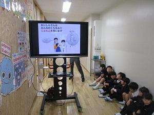 1年生には「ひよこのろくちゃん」「さるじぞう」「まんまるまんま たんたかたん」「くわずにょうぼう」「ぼくのは」などの紙芝居をしていただきました。のまりんワールドにあっという間に引き込まれ、手遊びも入れて45分間、お話の世界を堪能しました。