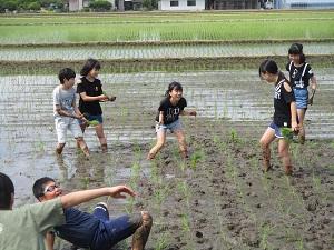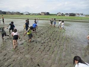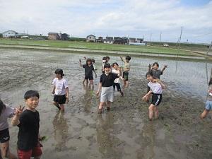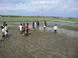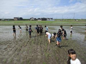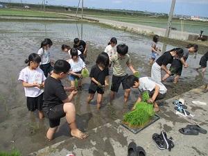 さて、昨日の雨で順延になった5年生の田植えを行いました。例年お世話になっているかほく市内の農家の方の水田の一角をお借りして、苗を植えさせていただきました。子供たちは、慣れない田んぼでの作業で、泥に足を取られバランスを崩し、悪戦苦闘の田植えとなりましたが、どの子も笑顔で、とてもよい体験ができたようです。この後、社会科や総合の学習で、稲作について学び、秋には稲刈り体験もさせていただく予定です。楽しみですね。