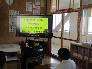 テーマは「睡眠」です。はじめに委員会の皆さんが作ったスライドで、睡眠の仕組みや成長とのかかわり、また心を落ち着けるホルモンとの関係などをわかりやす説明してくれました。その後、学校医の先生に、インタビューした動画と、PTA広報部の方のお話を聞きました。子供たちが一生懸命作ったスライドは、本当に素晴らしく、睡眠の大切さがよくわかりました。今後タブレットでお家の方にも見ていただきます。また、一緒に「チャレンジカード」にも取り組みます。子供たちが、朝しっかりと目覚め、元気に一日を過ごすためにも、睡眠の大切さを一緒に学び、規則正しい生活ができるようご協力ください。