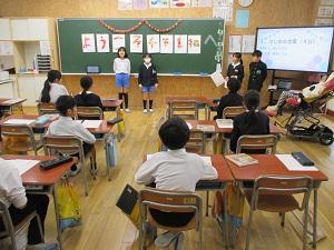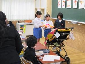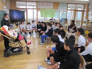 さて、4年生は総合的な学習の時間に「共に生きる」という学習をしています。今日は、いしかわ特別支援学校に通っている地域に住む身体の自由なお友達との交流授業をしました。