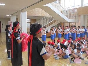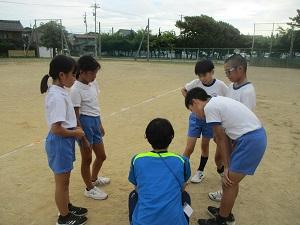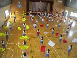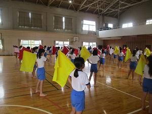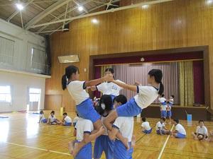 運動会まで、あと4日。高学年の団演は、いよいよ組体操に突入しました。なかなか難しいスタンツの技を一生懸命頑張っています。怪我に気を付けてしっかりとコツをつかんでほしいものです。中学年の団演はほぼ仕上がりに近づきました。今日は大漁旗を振りながらのかっこいい演技が見られました。また今日のわんぱくタイムでは、赤白に分かれて応援練習をしました。団長を中心に、迫力いっぱいの応援でした。