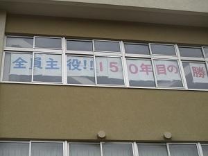 いよいよ学校の正面にスローガンが張りだされました。「全員主役!150年目の勝利を目指してLet's challenge」代表委員会で決まった、今年にふさわしいスローガンですね。今日は、1・2年生が玉入れの練習に頑張っていました。また放課後には応援団も頑張っていました。どんどん声が出てきて、これからが楽しみです。