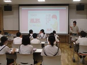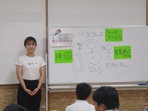 松田亜希先生には、昨年に引き続き今年も授業をお引き受けいただきました。昨年は「音読」をテーマにお話いただきましたが、今年は「会話はキャッチボール」をテーマに授業をしていただきました。