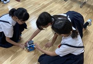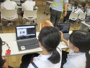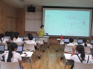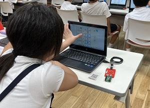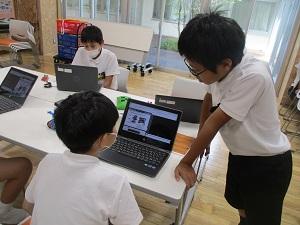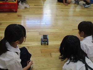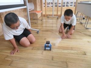 プログラミング教室2日目は6年生です。使用しているのは、昨日と同じ「Ichigo Jam」というコンピュータです。6年生は、昨年も経験していることもあり本格的なプログラミングで、「ぶつからないロボットを作ろう」という授業に挑戦しました。3~4人グループで、ロボットからセンサーを出させ、それを自分たちの止まってほしい距離でロボットを止めるというプログラミングに挑戦していました。子供たちののみ込みの早さ、また実際に自動車などに使われている事故防止のための機能も、このようにして作られているのかととても感心しました。子供たちの豊かな発想で、未来の生活がさらに安全安心になったり豊かになったりするプログラミングが開発されていくことを期待したいですね。