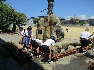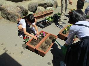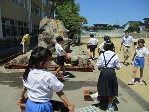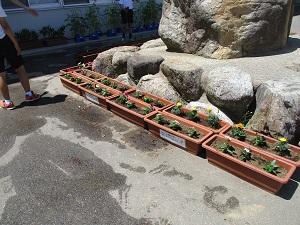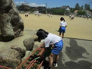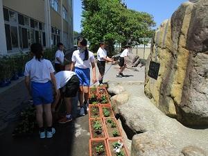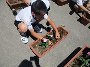 今日の昼休み、環境委員会のみんなが人権の花の苗をプランターに植えました。インパチェンス、ニチニチソウ、マリーゴールド、ベゴニア、ペチュニアの5種類です。土を入れたプランターに大きめの穴を掘り、ジョウロで水をためてから、しっかりと根元を抑えて植え、たっぷりのお水をあげました。これから毎朝、環境委員さんがお水をあげて育ててくれます。夏を彩る5種類の花が玄関を飾って、七塚っ子に元気をくれることでしょう。環境委員さん、どうもありがとうございます。これからもよろしくお願いします。