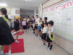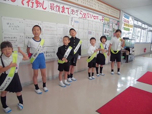 2学期は,わんぱく班で朝のあいさつ運動に取り組んでいます。担当グループは3日間責任をもって参加し,元気なあいさつをしてくれた友だちを見つけて,お昼の放送で紹介しています。多くの子どもたちが,笑顔で元気よく挨拶しています。