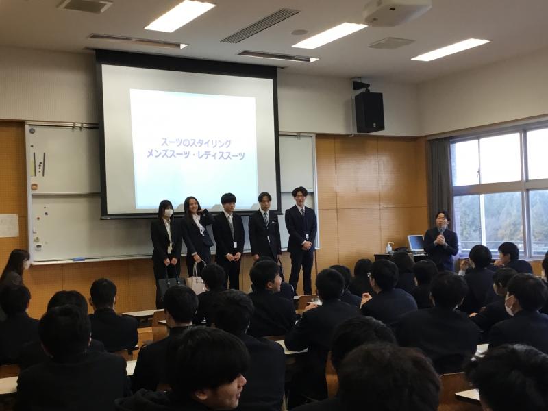 セミナーでは場面に応じた服装のマナーやルールなどや、スーツを着る際に注意すべきチェックポイントについて説明していただきました。また、本校生徒5名をモデルとして実際にスーツを着せていただき、皆の前で見てもらいながら説明していただく場面もありました。生徒たちは友達のモデル出演もあり、楽しみながら真剣にセミナーに参加していました。