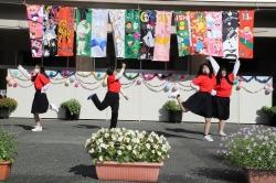 【懇親会 演劇科生徒によるアトラクション 藍染、玉ねぎ染の衣装で校歌を歌いながらダンス】