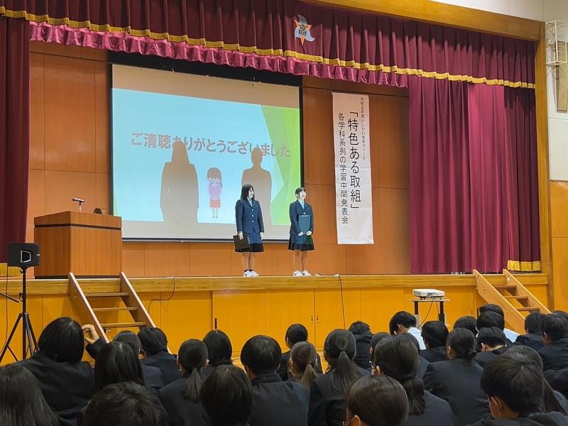 「特色ある取組」は各科発表会でした。機械システム科、演劇科、総合学科農業系列、総合学科ビジネス系列の順で、各科・系列が取り組んでいる活動内容について3年生代表者が発表しました。スライドや動画を用いて活動状況を分かりやすくまとめて発表し、生徒たちは相互理解を深めることができました。
