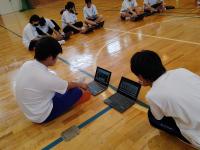 演科科2年生が、互いにアドバイスをしながら投球フォームを改善していく授業です。クロムブックを使いながら、自分の投球フォームを確認し、次に投げるときには、改善したいイメージをはっきり持って投げていきます。