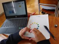 授業では、「色の感じ方と草花の配色について考えよう」というねらいのもと、色の3属性(色相・明度・彩度)について学んだ後、色相環のワークシートを用いながら反対色や補色など、色の関係性について一つ一つ学んでいきまた。