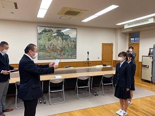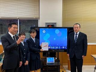 本校からは生徒会の24H藤岡 青空さんと25H卜部 未彩さんが贈呈式に出席し、藤岡さんから「ICTを使った活動が増えている中、このような学びやすい環境が整ってきたことに喜びを感じます。このモニターを活用して、勉学に励みたいと思います。」と、お礼の言葉を述べました。