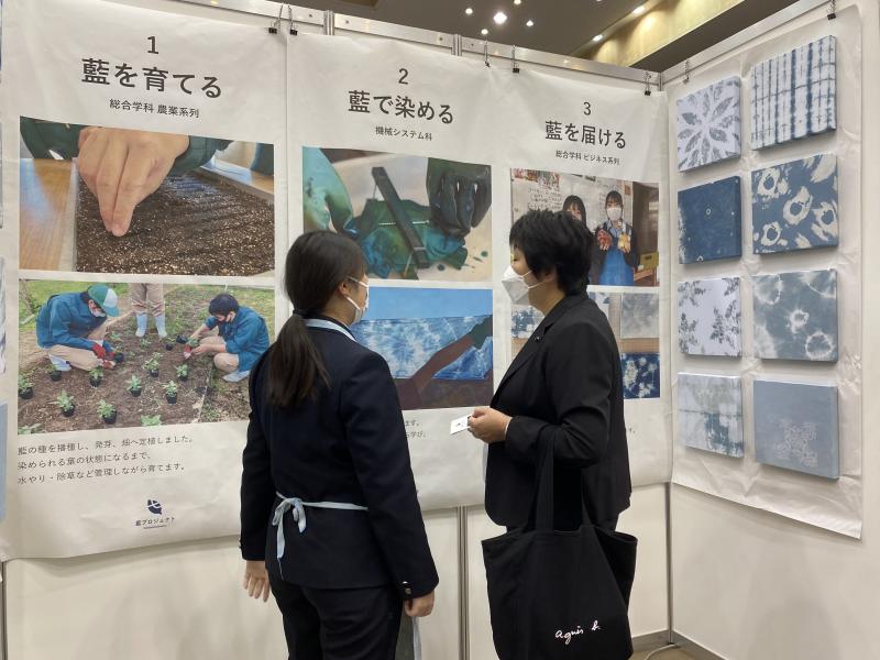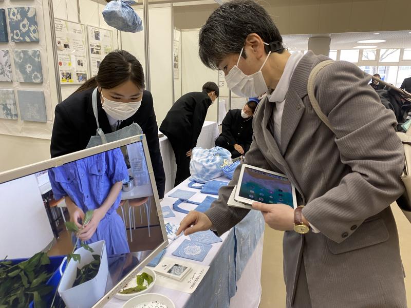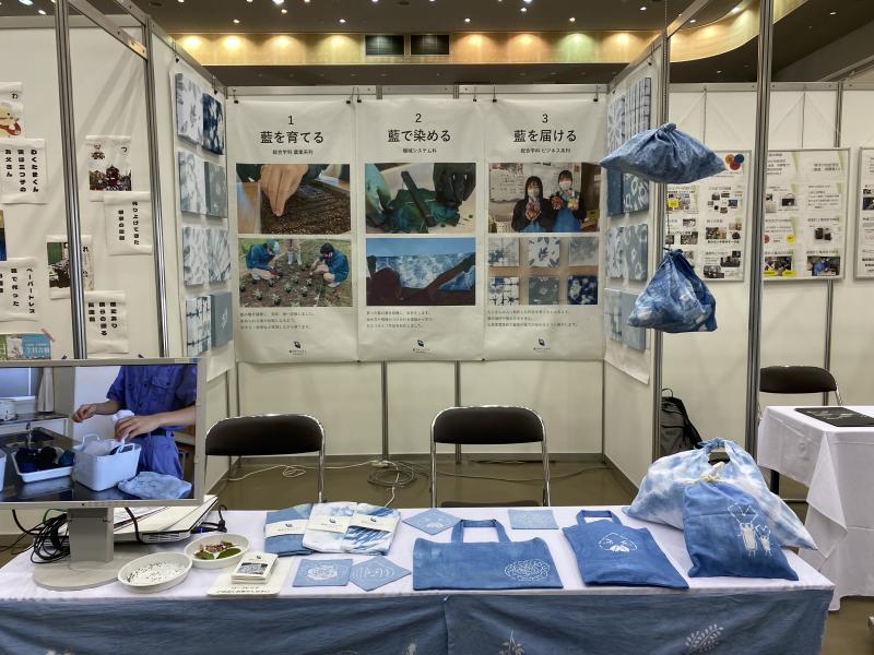 2022年11月6日 10時06分産学連携展示ブースでは、自分たちで染めたエプロンを着て、今までの取り組みを来場者に説明しています。