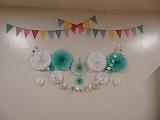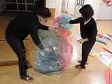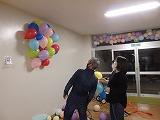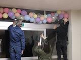 21日(木)の17時から、飯山PTA会長、金守母親委員長をはじめとして、5名の有志が集まって、D棟1階の体育館渡り廊下付近でビニール傘と風船を使って、飾りつけを行いました。