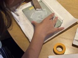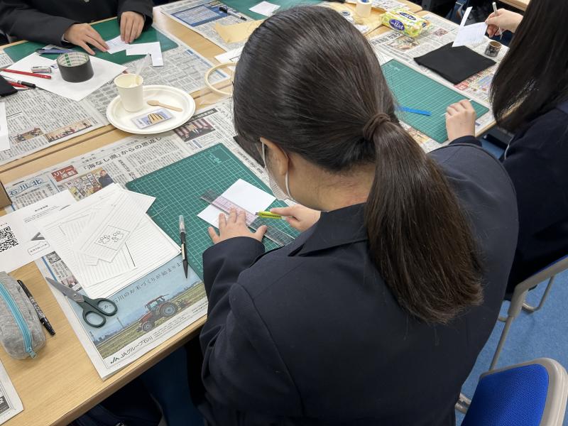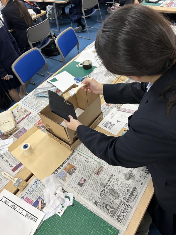 他校の生徒とグループになり、グループで協力し教え合いながら制作をしました。カッターを使って模様を切り抜くのはとても難しく大変でしたが、金箔を貼るととてもきれいに仕上がり達成感を味わうことができました。