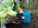 演習林に入るとお目当ては、「アカモミタケ(カマツミミとも)」というキノコです。モミ系の木の周辺に生えているキノコで、全体にオレンジ色をしています。お味噌汁や炊き込みご飯の具として食べます。今年はたくさん出ているようで、注意深く探すと「ここにも、あそこにも」と見つけることができました。