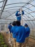 野菜のビニールハウスでも対応が必要です。3人一組になって、脚立を用いながら支柱を立てる作業を行いました。安全に気を付けて、脚立を使う際はストッパーをかませること、落ちないように下で支えること、などを確認し、2棟分の支柱を立てました。