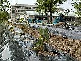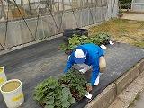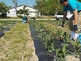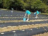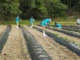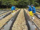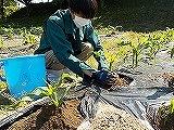 ビニールマルチに穴を開ける、植穴一つひとつに苗を置く、芽(芯)を同じ方向に向け“舟底植え”で植え付ける、潅水する、という一連の作業ですが、繰り返し行う中でポイントが分かり要領もよくなっていきます。