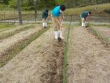 3月下旬に畑に定植したネギです。ひと月余り経ち、少し大きくなりました。施肥をして根元に土を少し寄せる作業です。