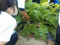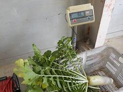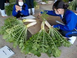 しっかりと生育しているダイコンは収穫も一苦労。「なかなか、抜けん」と引き抜くのに苦労する生徒が見受けられました。中には「人の足みたい」に又割れしたもの(岐根 きこん)やタテに亀裂の入ったもの(裂根 れっこん)もあり、驚く生徒もいました。これらの原因についても学習するとともに、最後の生育調査として、葉の長さ、葉の枚数、全体の重量、ダイコンの重量、ダイコンの太さを1本1本計測し、お店に売っているような大根を作るには、時間と労力、技術が必要であることを学びました。