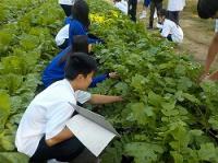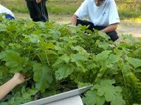 ほぼ順調に成長しているようで、ダイコンの根の部分も地上部に伸びてくる「抽根(ちゅうこん)」がみられるようになりました。「わぁ~、ダイコンの形になっとる」という生徒の声も聞かれ、ノギスを使って太さを測ってみると3~4cm、太いものでは5cm余りになっていました。