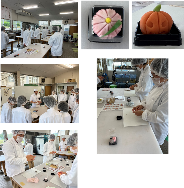 石川県職業能力開発協会の「令和6年度若年技能者人材育成支援等事業」の1つとして「ものづくりマイスターによる和菓子講習会」を実施しました。羽咋市にある和菓子店「佐吉庵」より岡崎さんを講師に招き、初回は練り切りの体験をしました。1つ目の練り切りは、ハロウィーンにちなんだかぼちゃのキャラクターです。ほとんどの生徒が練り切りを体験するのは初めてで、講師のデモンストレーションをびっくりした様子で見ていました。いざ自分で作るとなると、講師の方のように、素早くきれいな形にするのが難しいことを実感したと思います。2つ目は、コスモスを作りました。ピンクの餡に白い餡を入れてぼかす技術や指で餡を押して花びらを作る技術などを学び、綺麗なコスモスを作ることができました。