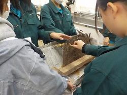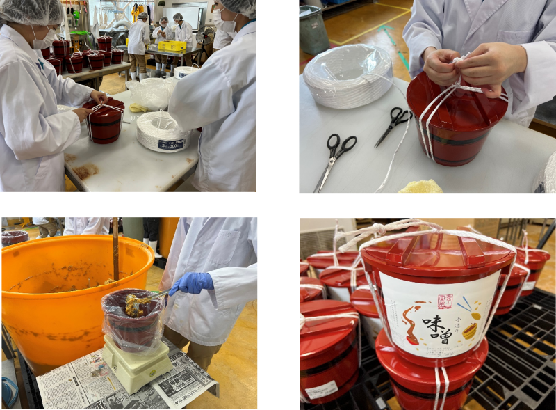 今回は4kg樽に味噌を充填して容器を紐で縛り、ラベルを貼って完成です。今年度からは4kg樽を赤色に変えてより目立つ、高級感のあるようにしました。男子は4kg樽に200kgほど入った大きい樽から移す作業をしました。実習が終わると腕が疲れるぐらいの体力仕事です。女子は樽を紐で縛る作業をしました。お客さんが持った時にバランスを崩して不安定にならないように中心に気を配って、きつく縛ることに苦戦していました。