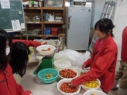 水耕のハウスではトマトが植わっています。大玉・中玉・ミニトマトで合計7種類。3年生は繰り返し実習をしてきたので、“大玉やミニトマトはハサミを使う”“種類ごとに分ける”など収穫にも慣れてきました。