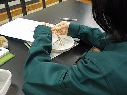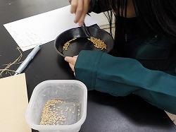 穂の長さが長いと思われるもの3本を選び、一本ずつもみの数を数えます。まず、穂からもみを外します。飛び散らないよう慎重に扱わなければなりません。そして、外したもみを数えます。事前の予想では「30~50粒ぐらい」と答えた生徒が一番多かったですが、実際に調べてみるとほとんどが100粒を超えていました。「想像以上にたくさんあって驚いた」と感想に記していました。