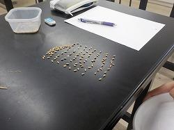 バケツで育てた稲の収量調査です。前回までに1株当たりの茎の数を計測し、今回は1本の穂についているもみの数を計測しました。