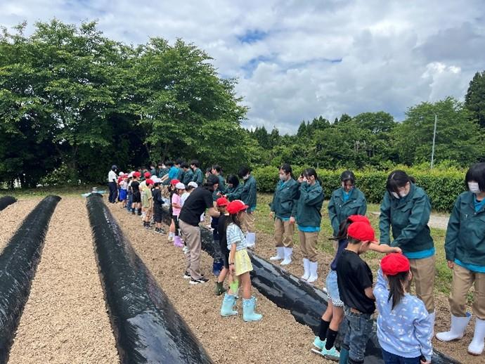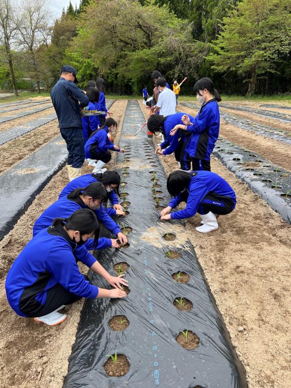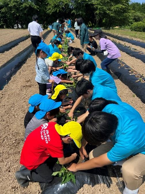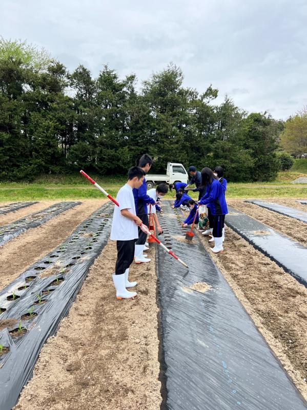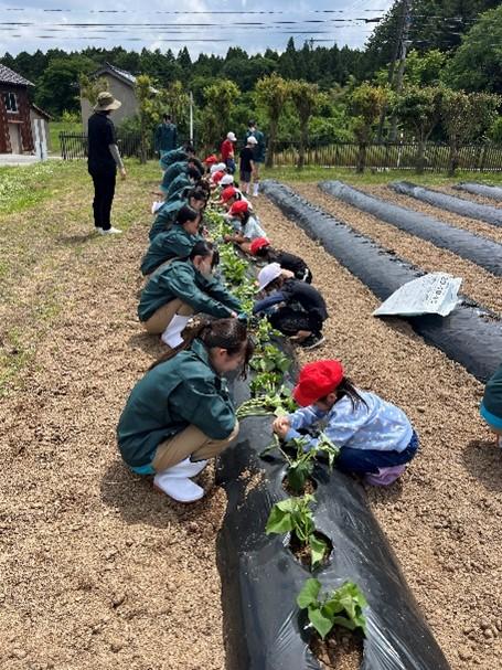 6月4日に朝日小学校の2年生25名とサツマイモの定植体験を行いました。本活動は本校でコロナ渦の年を除き毎年実施しています。最初に紙芝居でサツマイモの苗について紹介を行いました。その後、小学生5人と本校生徒4~5名でグループを作り、定植を行いました。本校生徒には事前に植え方のレクチャーをしてあったので小学生に丁寧に教えながら仲良く定植する姿が見られました。生徒も前の日から「明日楽しみ~」といった声も聞こえ、終わった後に感想を聞くと「楽しかった~次はいつ?」などと次の定植体験を楽しみにしている様子でした。朝日小学校の皆さんも笑顔で帰っていかれたのでよかったです。次は9月の収穫体験で再会できるのを楽しみにしています。