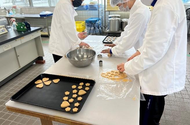 農業科目「食品製造」でクッキー(塩きなこ味)の製造を行いました。3年生は今年に入って3回目のクッキー製造ということもあり、回数を重ねるごとにうまく生地を均等な厚さで仕上げることができていました。生徒も「生地を伸ばすのも、型を取るのも手際よくできた。前よりやり直しも少なく、成長を感じた」と生徒自身も成長が感じられるぐらいに上達していました。3年生は少ない人数での実習ですが、全員が片付けまで頑張って作業をしていました。また、今年度からは大きい新しい型を使って製造をしています。人間やハート、星などこれまでにはなかった型を使ってクッキーを作っていますので手に取った際は見てみてください。