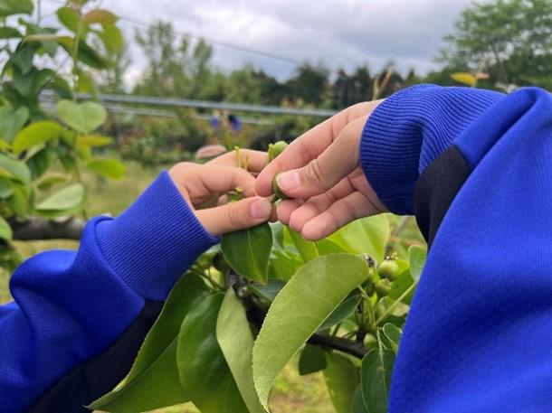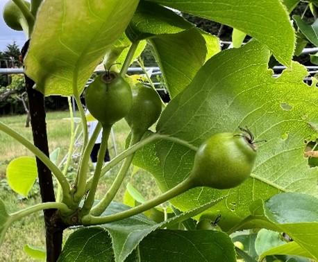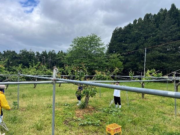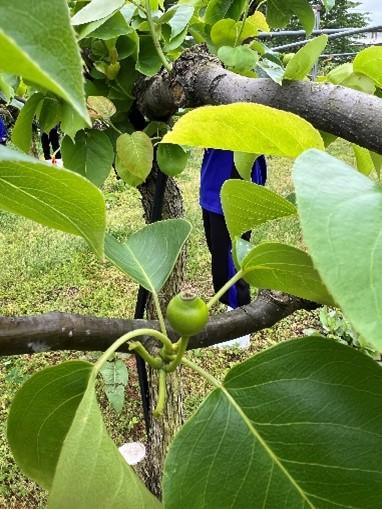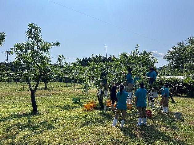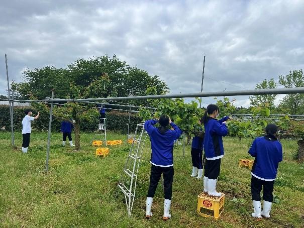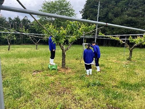 本校には、新水、豊水、新高の3品種あり、全部で14本の木があります。今回は、2年生が2時間で班別に分かれ、すべての木の摘果をしました。果実を探し、摘果するという地味な作業でしたが、はしごやビールケースに乗って一生懸命果実を探して摘果を行っていました。最初は「先生、この場合はどれを摘果したらいいですか。」といった質問が多くの人から出ましたが、慣れてくるにつれて迷うことがなくスムーズに摘果をすることができました。梨は今後、袋がけなどを行い、夏に収穫予定です。今後もリンゴ、桃、キウイなどで摘果作業を行っていく予定です。