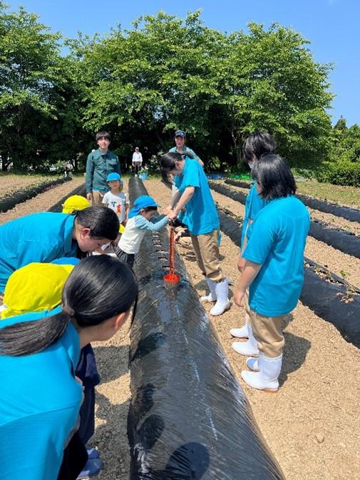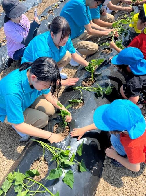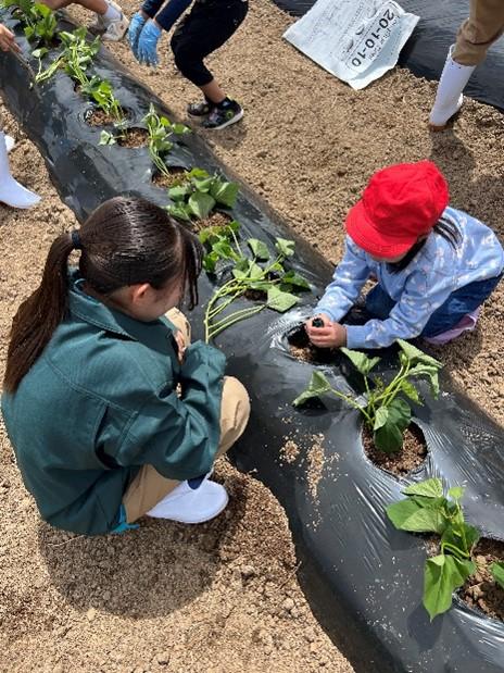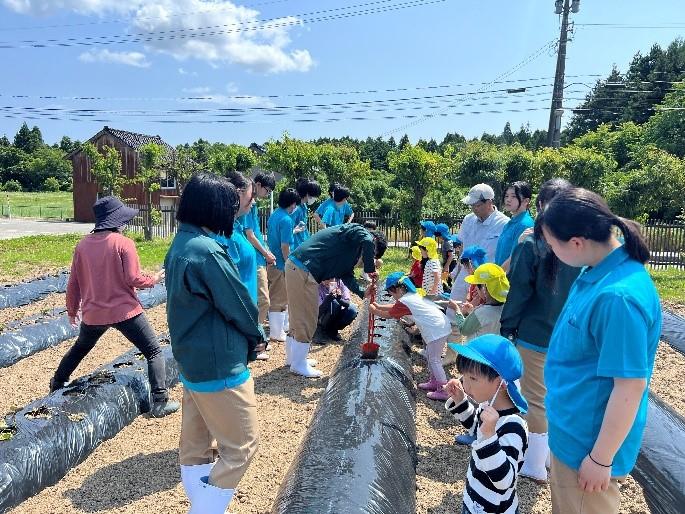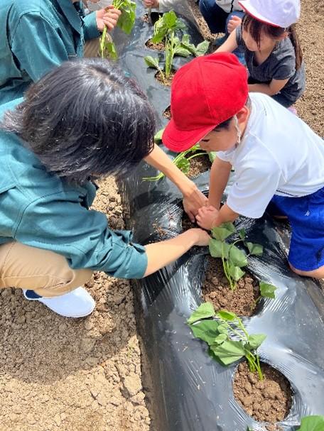 先週からスタートした小学生、園児とのサツマイモ定植体験も今回で3回目となりました。3回目は西湊保育園の園児19名が参加してくれました。元気いっぱいの挨拶からスタートし、生徒が紙芝居でサツマイモの苗について紹介しました。その後、生徒と園児がグループになって畑まで一緒に行き、まずホーラーで植える場所のマルチを剥がしました。そして、シャベルを持って園児が深い穴を掘り、苗を定植しました。今回植えた品種は金時です。植え方は船底植えというやり方で植えました。生徒も園児との接し方、教え方が回数を重ねるごとにうまくなっており、生徒の成長を感じられた定植体験となりました。残すはあと1回で最終回は本宮のもり幼保園の園児たちと行う予定になっています。今回の定植体験については6月12日の北國新聞朝刊にも取り上げられていますのでぜひご覧ください。