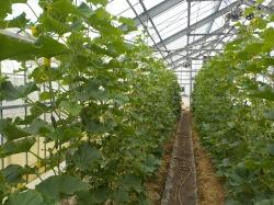 4月11日にハウス内に定植したキュウリは順調に生育し、現在は背丈が2m以上にもなっています。5月の下旬から収穫が始まり、毎日袋詰めして出荷しています。