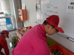 6月6日、今年度最初の校内販売が始まりました。1時間目の実習でキュウリを収穫し、そのまま袋詰めしました。新タマネギやスナックエンドウ、ゼラニウムの鉢植えといっしょに玄関前に並べました。