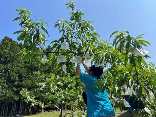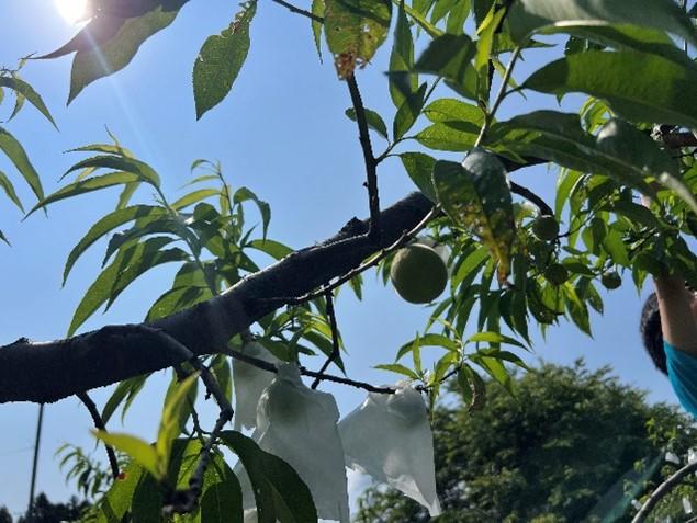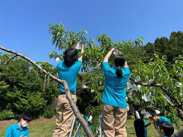 農業科目「果樹」でモモの袋掛けを行いました。既に2・3年生の実習で摘果が終了し、1つの枝に1個の実がなっている状況です。袋掛けは病害虫から守ることや外見を美しくさせるために行う作業です。まだ、大きさは成長途中であるためテニスボールより小さいですが、これから7月の収穫に向けて大きく成長し、みずみずしくておいしいモモができる予定です。本校で栽培したモモは残念ながら販売はされませんが、生徒が自ら収穫して持ち帰る、ジャムとして食品製造の実習で加工するなどして使われます。加工したモモジャムは9月にJA直売所などでも販売される予定なので見かけた際はぜひご購入ください!今後はナシの袋掛け、リンゴの袋掛けと続いていきます。