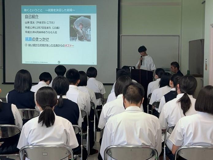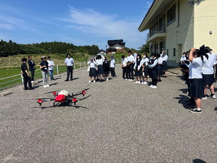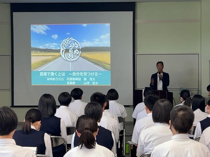 最初に社長の裏さんから会社の概要やこれまでに取り組んだこと、社会人になった時に必要な資質などについて講演していただきました。そのあと、営業部の若手社員である山澤さんから「ゆめうらら」に就職しようと思った経緯や今している仕事について、社会人の先輩としてのアドバイスということで講演をしていただきました。次に山澤さんがしているドローンの作業風景を見学させていただきました。スマホでルートなどを設定すると自動でそのルートに薬剤や水を散布してくれ、終わったら基地に戻ってくる様子を見させていただき、農業の最新技術を目の当たりにして生徒は興味津々といった様子で見学をしていました。