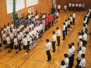 川内学校長激励の言葉、小浦生徒会長激励の言葉のあと、各部からの決意表明がありました。応援団をリーダーに校歌、応援歌、三三七拍子と続けて、選手の健闘を全校生徒で祈りました。