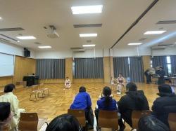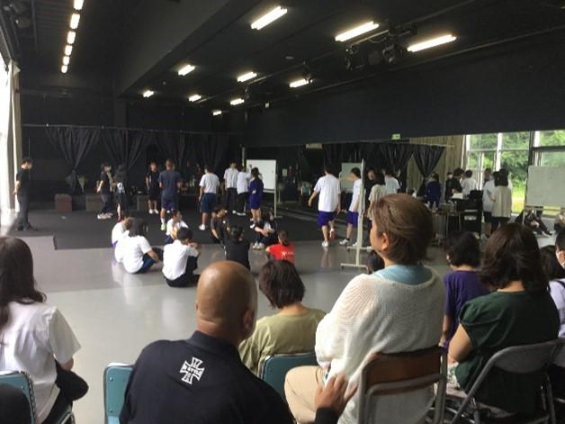 3学年合同で授業、それぞれの練習の成果を互いに見合います。他学年の演じるものを見て刺激をもらいます。演技だけでなく人とした大切なことも指導していただきました。