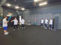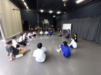 挨拶後は2階にある「研修室」での授業が始まります。今日の授業のスタートは「自分のお気に入りのファッション」というテーマでのディスカッションでした。高校生はやっぱりおしゃれには敏感なんですね。その後は、体のリラックスやシャドーボクシング、空想大縄飛びやお互いの体の一部が触れあっている状態でお互いの体を動かす「お互いの体を操る」をしました。大縄飛びと体を操っている様子は下の動画でご覧ください。