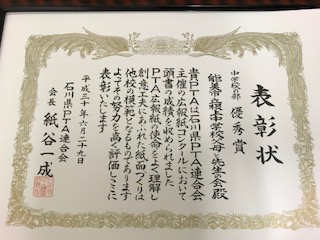 その会で石川県PTA連合会、広報紙コンクール中学校の部 優秀賞の表彰を受けてきました。