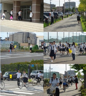 公安委員会の生徒が、PTA役員・委員の皆さん、金沢市戸板校下婦人会(浜下さん、今西さん)のご協力をいただき、挨拶運動や自転車マナー向上の声かけを実施しました。