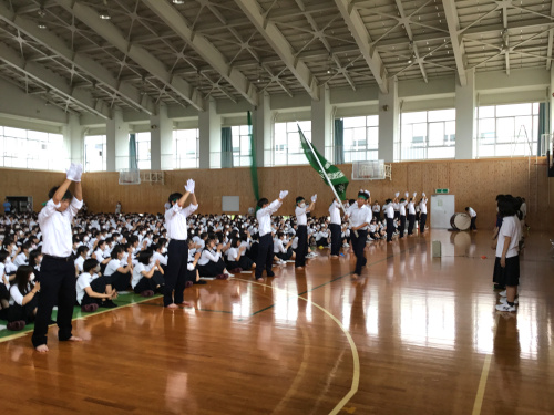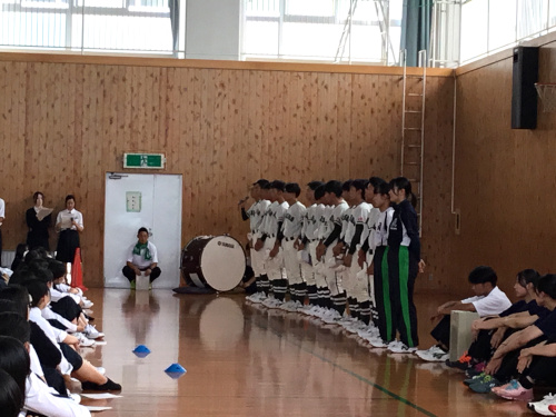 その後、各部の決意表明があり、応援団長1年生鳰 侑紗さんの音頭でエールを送り全校一丸となって激励しました。