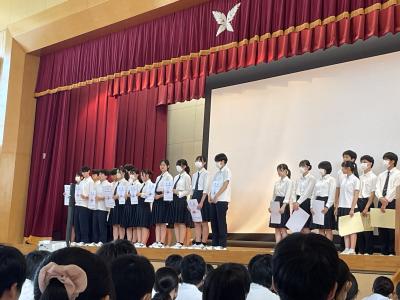 7月20日(木)、終業式に先立ち、1学期伝達表彰式を行いました。女子バスケットボール部、ラグビー部、陸上競技部、フェンシング部、水泳部、かるた部、放送部、棋道部がそれぞれ、いただいた賞状を掲げ、全校生徒に対して賞状を披露しました。