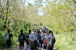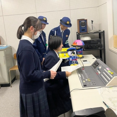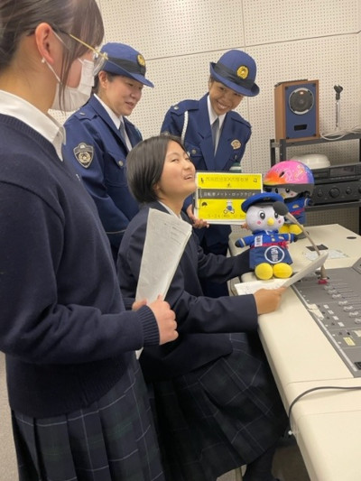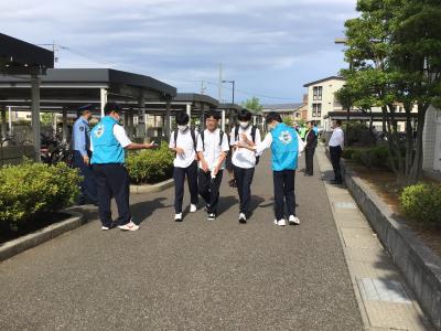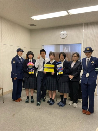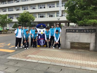 ロック隊の隊員たちは、金沢西警察署のマスコット「にしまもる」君と一緒に、生徒たちに「自転車盗難防止のために二重ロックをしましょう」と呼びかけていました。