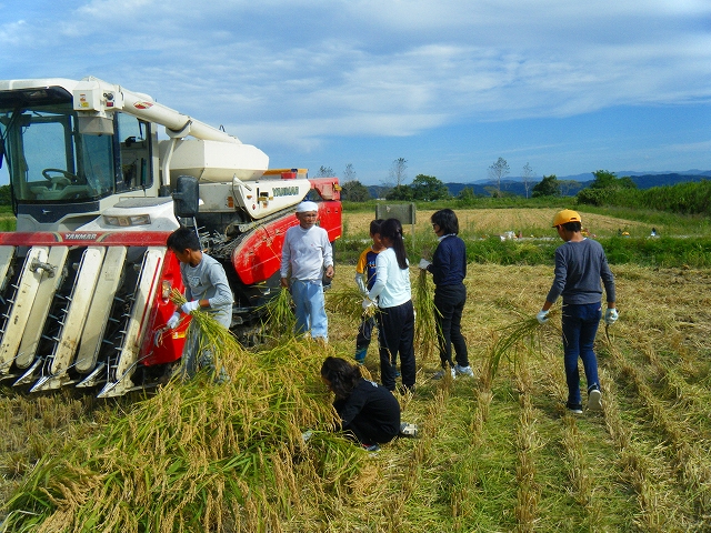 5年生たちは上手に鎌を使い、稲を刈り取ってコンバインの中に入れてきました。