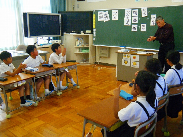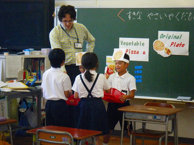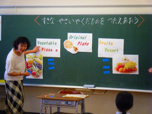 「I like ~」を使って、いろいろな野菜や果物を英語で伝え合う活動を行いました。子どもたちは、ALTに英語での言い方を聞いて、どうにかして好きな野菜や果物を相手に伝えようと頑張っていました。